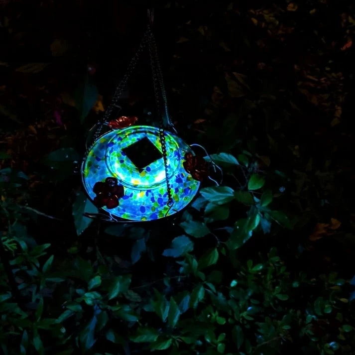 Illuminated hummingbird feeder features hand blown glass base and top, holds 18 oz. of nectar. Powder-coat metal perch for hummers’ comfort with sturdy chain for quick hanging.